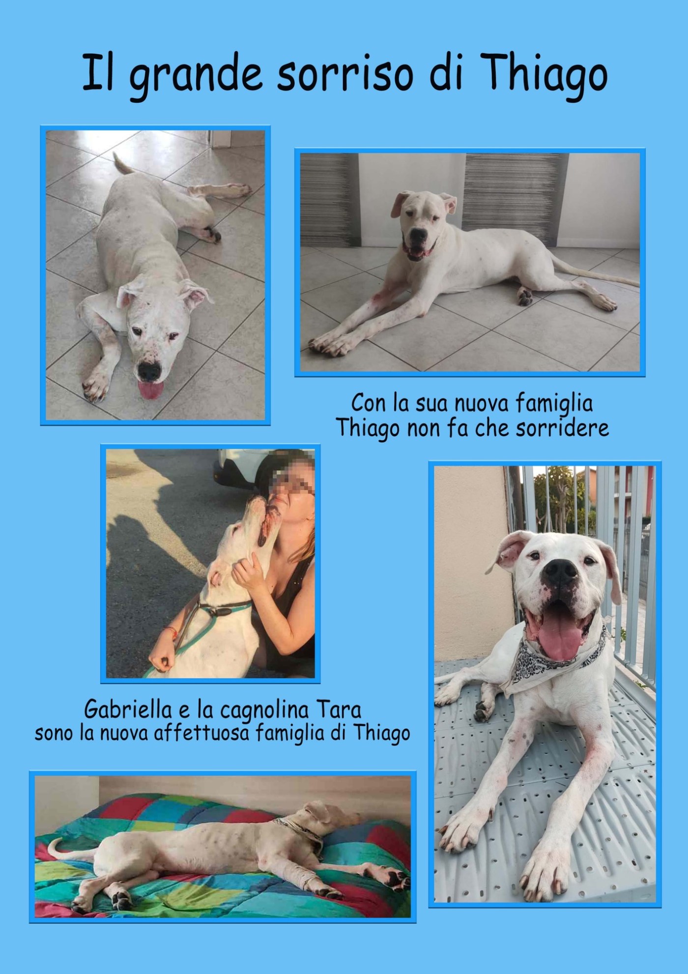 Thiago era stato trovato in una strada di campagna, pieno di ferite da morso, infette. Era tutto sporco, con gli occhi semichiusi e talmente massacrato da non potersi alzare. Curato e accudito al rifugio Enpa di Copertino, pian piano le ferite del corpo si sono rimarginate e con la vicinanza dei volontari, anche quelle del suo cuore. Thiago si è rivelato un cane fiducioso e amorevole, malgrado in passato dalle persone deve aver ricevuto tanta sofferenza, ed è rimasto a vivere al canile per anni, come capita a tanti molossi che popolano i rifugi e qui finiscono per trascorrervi vite intere. Gabriella ha visto Thiago sui social, ed è rimasta impressionata dalla tristezza del suo sguardo, in un post che lo mostrava in cerca di famiglia. E per lei è stato facile decidere di donare una famiglia a questo cagnolone bisognoso, avendo perso da poco l’amico a quattrozampe, dogo anche lui, e desiderando anche risollevare la sua cagnolina Tara. Gabriella ha subito contattato i volontari del rifugio, e dopo previa conoscenza, ha potuto portare Thiago con sé. Sono innumerevoli i cani che vivono per anni nei rifugi, ai quali per vari motivi non è facile trovare una sistemazione familiare, ma per i molossi è un’impresa ancora più ardua, anche se si tratta di un gigante buono come Thiago. Nei rifugi, i volontari Enpa accolgono, curano, giocano, allattano, accarezzano, per tanti animali diventano gli amici, i genitori, i compagni, l’unico punto di riferimento. Grazie a tutte le persone che aiutando a distanza, sono al loro fianco, per rendere più facile la vita quotidiana di tante creature www.enpa.org